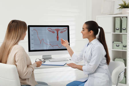 3D uterus model is used for patient education during a gynecology visit. Gynecologist explains the female reproductive system using a uterus model