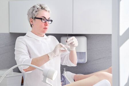 Gynecologist with syringe makes an injection to patient in gynecology chair