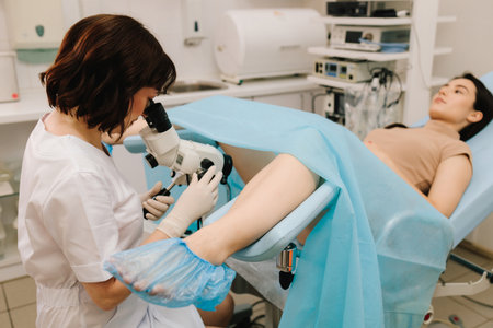 Gynecologist performs colposcopy with professional microscope. Patient undergoes gynecological exam with modern colposcopy equipment. colposcopy exam at gynecology clinic