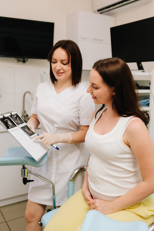 Pregnant woman talks with her gynecologist doctor in medical clinic. Gynecologist doctor consults patient expecting a baby about pregnancy during checkup