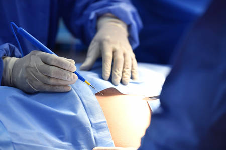 A skilled surgeon marks the patients belly with a marker before surgery under optimal lighting conditions, ensuring accuracy in the procedure.