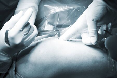 cosmetic liposuction surgery in actual operating room, group of surgeons working with cannula