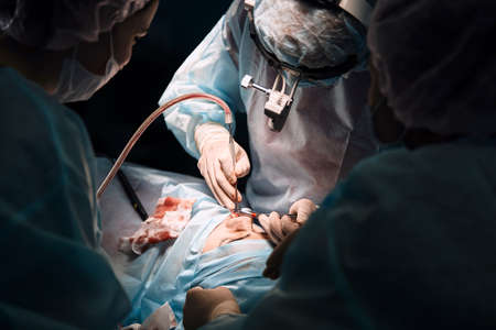 Team surgeon at work in operating room. Surgical light in the operating room. Preparation for the beginning of surgical operation with a cut. The surgeon is performing surgery on the patient.