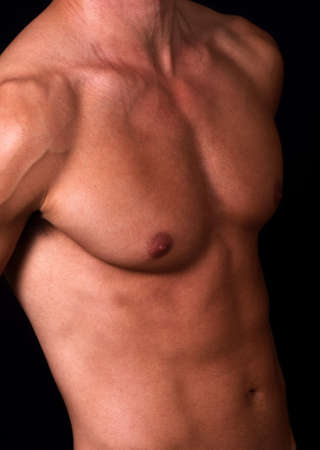 Close-up mid section of a shirtless muscular man over black background