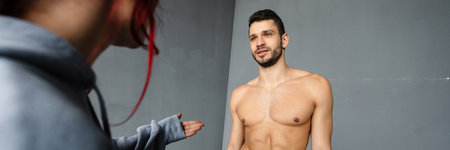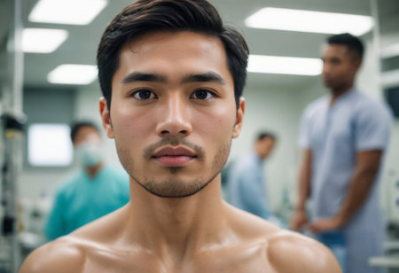 Tummy tuck, liposuction, breast surgery. A plastic surgeon prepares a man for plastic surgery.