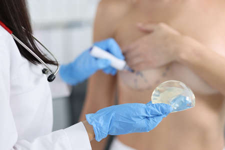 Plastic surgeon holding silicone breast implant and applying preoperative markings to patient chest closeup