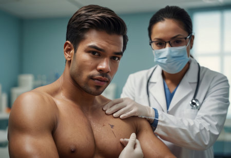 A female nurse in a modern clinic, giving an injection to a male patient, focusing on care and precision.