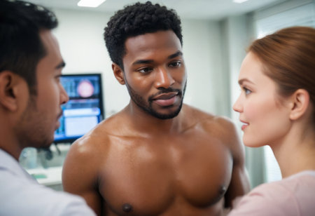 Two doctors discussing a patients treatment plan with him in a medical consultation room, emphasizing patient care.