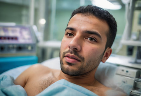 A patient lying in a hospital bed, recovering after surgery, with a look of relief.