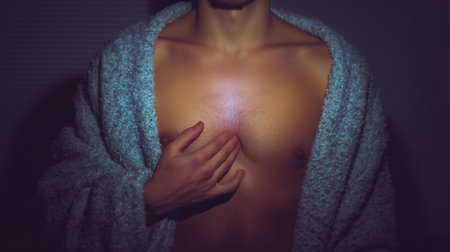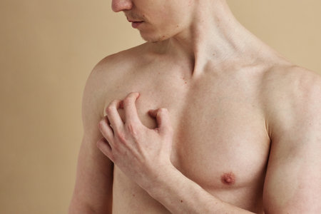 Minimal closeup of shirtless young man scratching skin with copy space