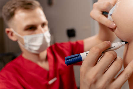 Doctor plastic surgeon makes marks with a felt-tip pen for plastic surgery to correct male breast, close-up.