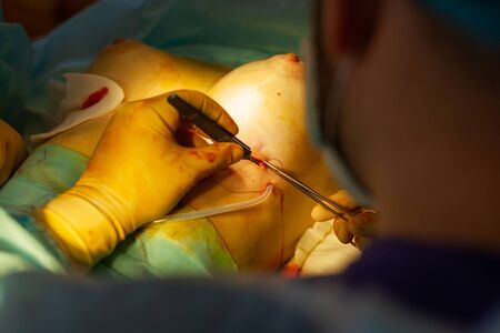 Breast implants in plastic surgery of body part. Surgeon wearing gloves operates womens breasts for augmentation. Doctor holding surgical scalpel instruments in clinic.