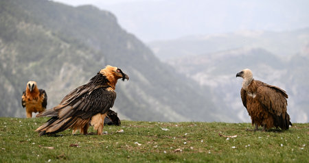 Bearded vulture or Gypaetus barbatus, together with griffon vultures.