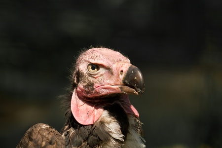 A detailed portrait showcases a vulture with its distinctive features prominently displayed. The bird is set against a dark backdrop, highlighting its textured plumage and the sharp detail of its beak and eye. The image may be suitable for various commercial uses, including editorial and educational materials. The lighting creates a dramatic effect.
