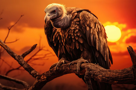Griffon vulture Gyps fulvus sitting on a branch at sunset, vulture is perched on a branch at sunset, AI Generated