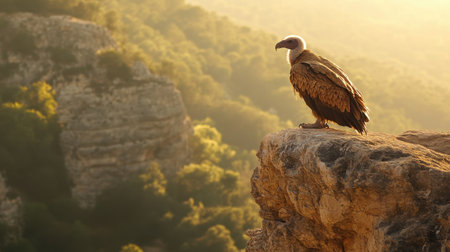 A Griffon vulture resting on a crag in Gredos, Spain, its regal profile illuminated by the warm light of the golden hour.