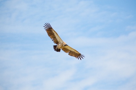 A White-backed vulture flying high with wings spread out in the blue sky, some white clouds