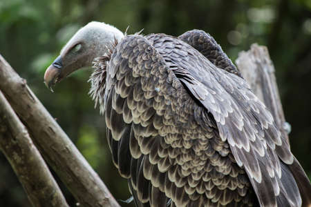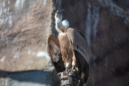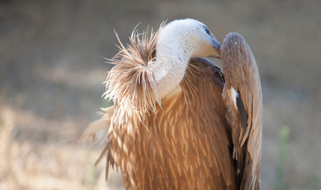 Griffon Vulture or Gyps fulvus perched, Extremadura, Spain. The animal cleans its feathers