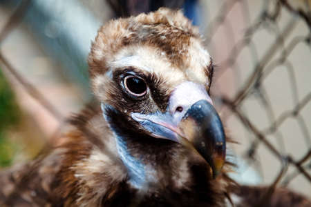 A portrait head shot of an endangered Himalayan Griffon vulture in captivity in a zoo.