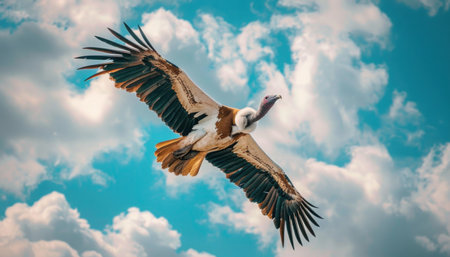 A large and majestic bird is soaring high and freely through a vivid, colorful, cloudy blue sky up above us