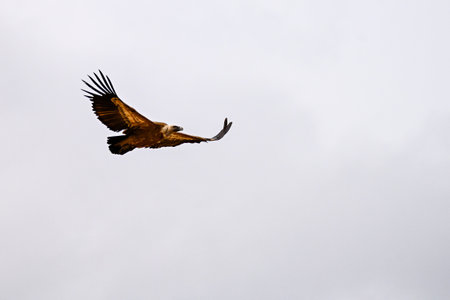 One griffon vulture (Gyps fulvus) flying in front of grey sky, cloudy day in springtime, Cres (Croatia)