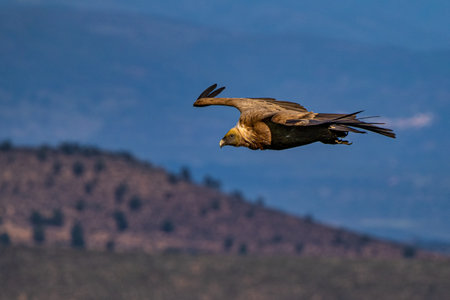 The Bearded Vulture soaring high above a rugged mountain landscape