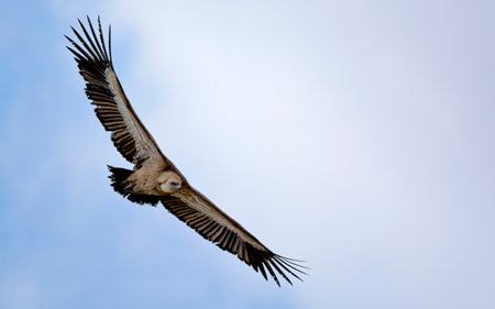 A White-backed vulture flying high with wings spread out in the blue sky, some white clouds