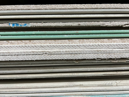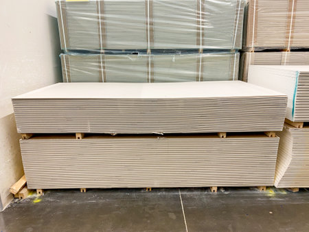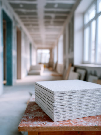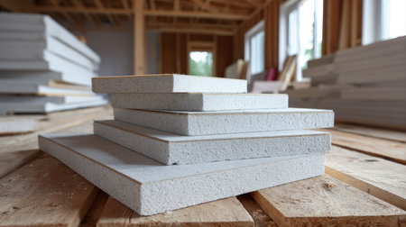 A close-up view of stacked drywall sheets in a construction site highlights the raw materials used for interior walls, surrounded by tools and light.