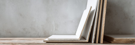 Drywall panels lean against a textured wall in a minimalistic setting, highlighting interior construction materials in a neutral color palette.