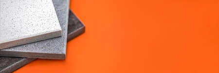 Samples of natural stone for kitchen countertops and floor tiles. Stone samples for countertops on orange background, copy space for design or text