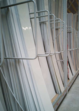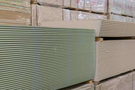 Drywall stacked in stacks at a hardware warehouse. Selective focus with blurred background.