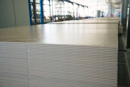 The stack of gypsum board preparing for construction. Gypsum plasterboard in the pack.