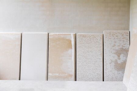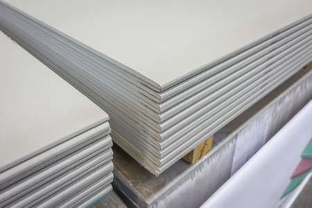 Professional Drywall Gypsum Board sheet. Nature Gypsum cement material for ceiling and walls. Modern Eco-friendly building material.