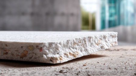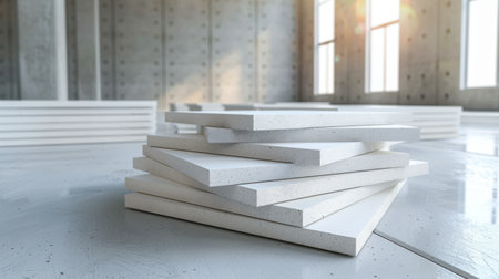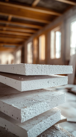 A close-up view of stacked white building materials in an unfinished construction site showcases the raw textures and organized piles waiting for installation.