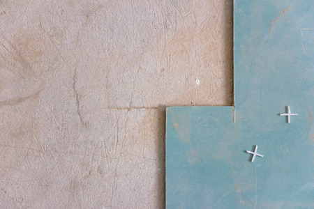 Sheets of plasterboard or drywall and tape-measure in an apartment during on the construction, remodeling, rebuilding and renovation