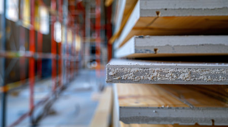 This image showcases a close-up view of drywall sheets stacked on a construction site, highlighting texture and detail with scaffolding in the background.