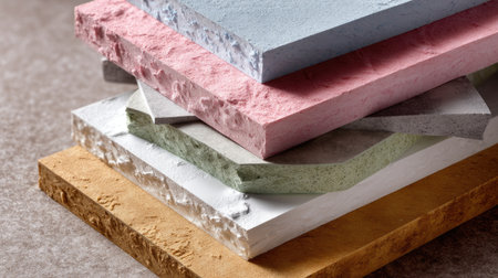 A detailed image of colorful layers of different building materials arranged in a stack, offering insight into textures and colors for design and construction projects.