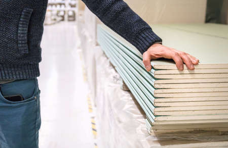Drywall in a hardware store. Drywall sheets for repair and construction. Repair and construction concept.
