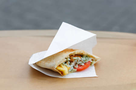 Close-up of delicious chicken wrap with fresh vegetables on a street background.