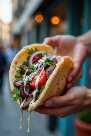 A person is holding a warm wrap filled with grilled meat, fresh tomatoes, red onions, and herbs. The lively street is slightly blurred in the background, highlighting the food.