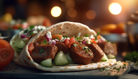Savory pita bread filled with grilled meat and fresh vegetables in a vibrant setting