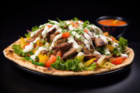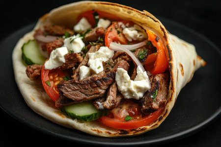 A mouthwatering Greek lamb shawarma pita with meat, tomato and onion slices, cucumber, and feta cheese in a white cream sauce on a black plate. Against a black background. A photorealistic picture taken using a Canon EOS R5 camera with an RF 24-70mm lens at a wide angle. --ar 3:2 --v 6.1 Job ID: 5166d00d-5be2-4987-bf7e-d0ecca43db8a