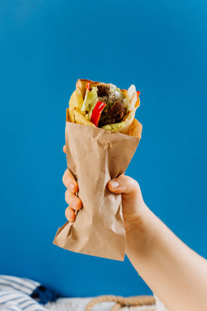 Hand holding falafel wrap with vegetables and tahini sauce, takeaway or street food lovers