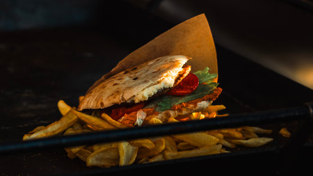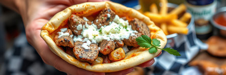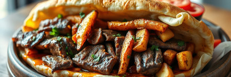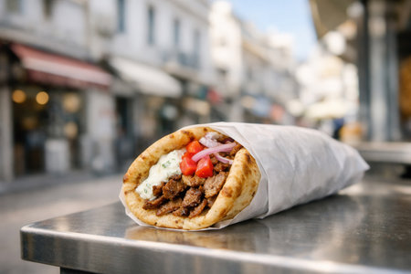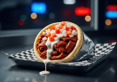 Delicious street food dish featuring grilled meat and fresh toppings served in warm pita bread