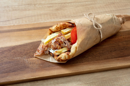 Shawarma Gyro pita on wooden table. Greek food, sliced meat, potato, tomato and tzatziki, paper wrap, close up view.