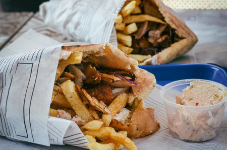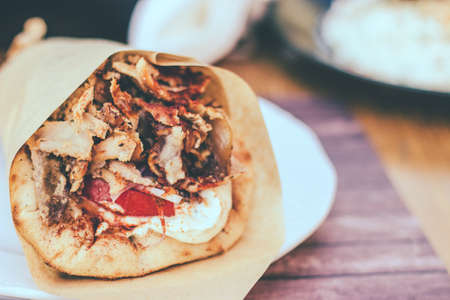 Close up of greek gyro sandwich with yogurt sauce in paper pack