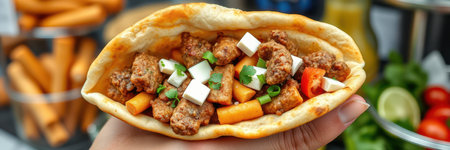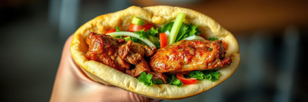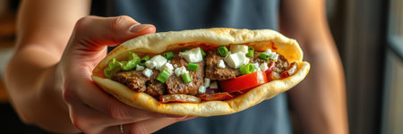Delicious hand holding a fresh and colorful pita sandwich filled with meat, veggies, and sauces ready to be enjoyed