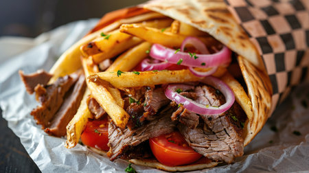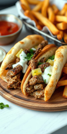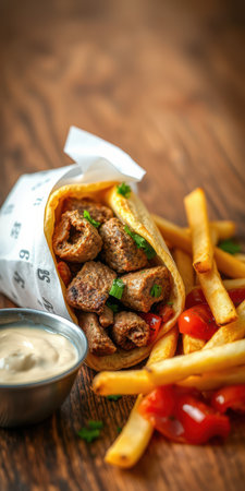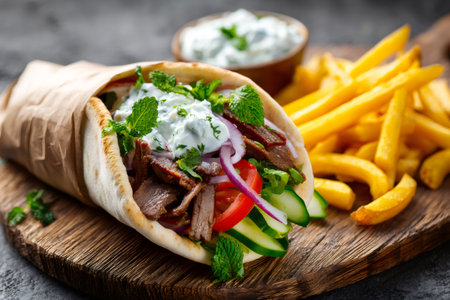 This appetizing image showcases a delicious gyro filled with tender meat, fresh vegetables, creamy sauce, and crispy fries on a rustic wooden board.