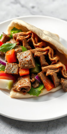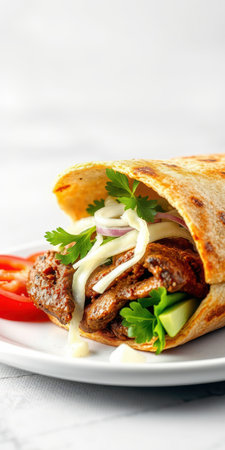 Savory kebab wrap filled with tender beef, fresh vegetables, and herbs on a white plate