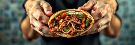 A man holding a wrap in his hands with some food on it, AI